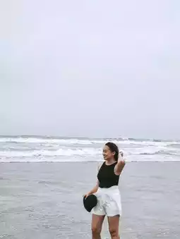 The weather was cloudy but I actually loved that cozy, calm vibe. No harsh sun, no crowd—just me, the waves, and the sound of the ocean. 🌊 I had so much fun walking barefoot in the water, splashing around like a little kid, and of course… snapping some cute pics for the feed 📸✨.
