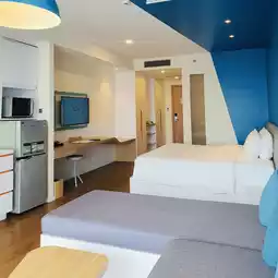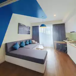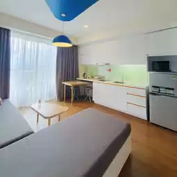 Atmosphere/Facilities: It's a new hotel, so it's clean, and the rooms are big in a high-rise building. There's not only a kitchen but also kitchen utensils, so it seems like it would be good for long-term stays. In fact, the 19th floor and above were used as apartments. There's a pretty big pool and gym, so it's good to spend time at the hotel. It was also nice to look at the view from the balcony. The ocean view would be pretty, but the city view was also pretty at night.