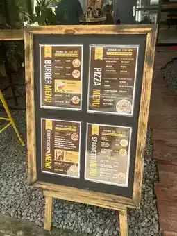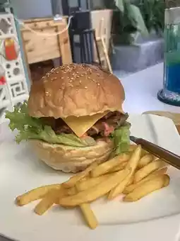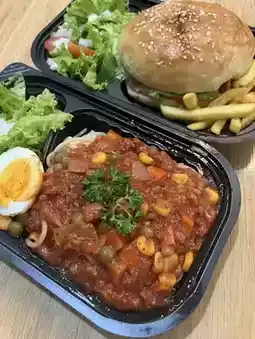 It sells hamburgers, pizza, spaghetti, salads, etc.
