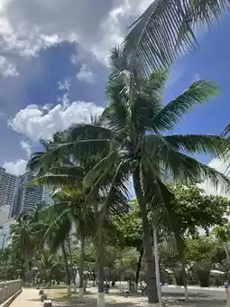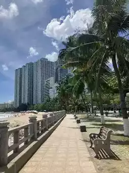 The palm tree-lined walking path is clean and perfect for a stroll or relaxation.