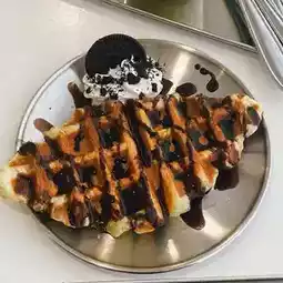 🥤This modern, spacious cafe opened in May 2022. They have both indoor and outdoor seating. The space is very spacious, but the tables and chairs don't look very inviting. This is probably due to the modern cafe's style. 👍🏻👍🏻 We sat in a closed, air-conditioned room, so it was quite noisy due to the echoing sound. The menu offers a wide variety of drinks, each of which was delicious. They also have a wide variety of waffles and cakes. I personally like Sol's waffles the most. They're fragrant, the batter is incredibly delicious, and every bite is incredibly satisfying. The prices are reasonable and not too high. 👍🏻🥰 The staff at the front of the shop deserves 100 points. While we were taking photos in front of the shop, they helped move our parked motorcycle to another location for a better photo opportunity. After we were done, they returned the motorcycle to its original location. 😆😆 Another thing about this cafe is that they don't allow food and drinks from outside the shop. And if you want to take photos for commercial purposes, there will be an additional fee.