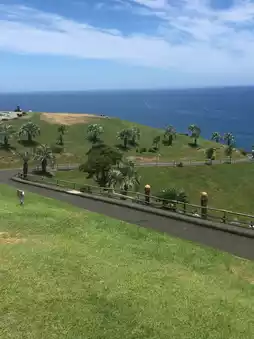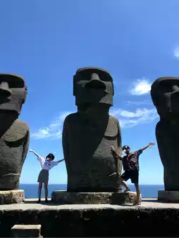 This place, where the contrast between the green of the grass, the light blue of the sky, and the deep blue of the sea is extremely beautiful, is a restored version of the Moai that was recognized and created by Easter Island.