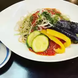 The soba noodles are Yabusoba, and although they also have the regular menu, I had the seasonal tomato soba. The soba noodles are based on tomato sauce and topped with deep-fried zucchini and other vegetables. It had a very elegant taste.