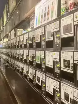 Just insert the required number of coins into the dedicated machine, which is lined with sake packages, and press the yellow button to dispense a sake cup full of sake.