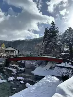 [Tochigi x Yunishigawa] Old houses and the red bridge where you can see the main house Hankyu. The snow scenery is wonderful.