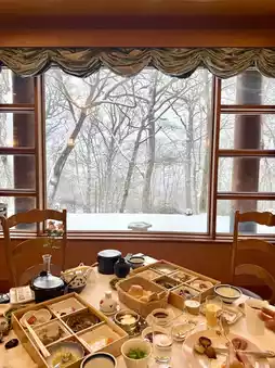 There are two breakfast options: Japanese and Western! If you choose Japanese, there is an extra charge. The nine-grid presentation is very delicate, and the overall atmosphere of the restaurant is also great!! There is a large floor-to-ceiling window in front of the dining table, so you can enjoy the beautiful snow view while dining 🍴 It is a feast for the eyes~