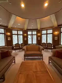 As soon as you enter, you can see a large fireplace, with the front desk on the left, the guest rooms on the right, and a lounge 🛋️ with a 180-degree view of the snow ahead. Sitting on the soft sofa by the fire and reading at night is also a great experience