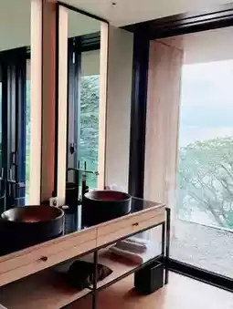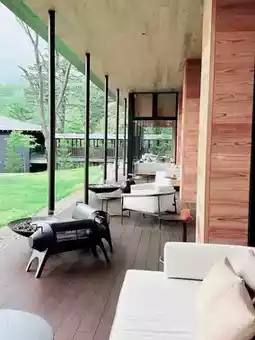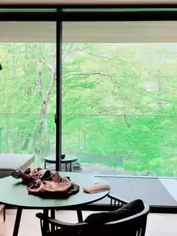 The hotel features 102 spacious rooms and suites, decorated in light wood tones with a Japanese minimalist design. Each room includes a private terrace or traditional engawa (veranda) offering stunning natural views.
