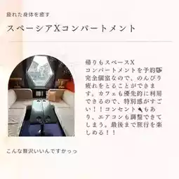 Spacia X has luxurious seats, and even the standard seats feel very special. WiFi is available! There are outlets. The seats are spacious 🙏 You can also rotate, so it's also great for group trips 🙆♀️