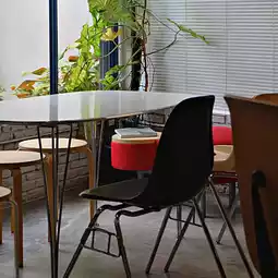 ทั้งแสงที่ส่องเข้ามาและต้นไม้กับเฟอร์นิเจอร์ที่ตกแต่งภายในลงตัวสุด ส่วนด้านบนเป็นเหมือนเป็นโซนแสดงงานศิลปะแต่ก็มีโต๊ะให้นั่งเหมือนกัน