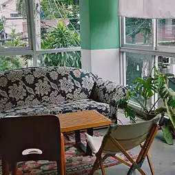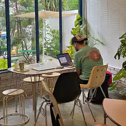 เป็นคาเฟ่สองชั้น ชั้นแรกให้ฟิลเหมือนนั่งทำงานในสวน