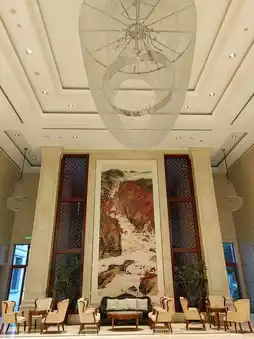 In the hotel lobby, corridors, and guest room walls, there are many large and small art works embedded, mainly Chinese landscape paintings, many of which depict the local landscape and cultural scenes of Ningbo.