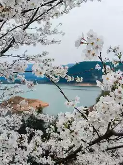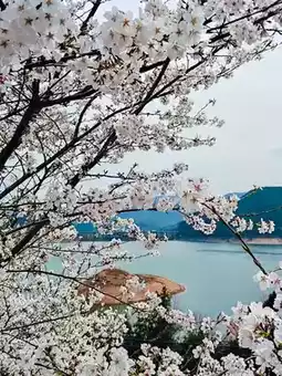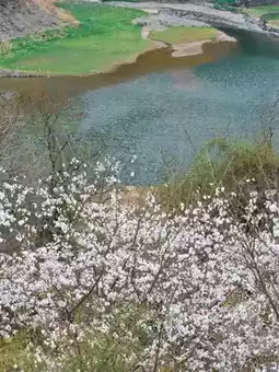 Here, a large area of cherry blossoms is blooming, both on and off the road, especially the cherry blossoms below the road, which can be taken against the backdrop of the green lake or the dam, very beautiful.