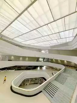 The tour route starts from the top floor and follows the surrounding ramps downward, allowing visitors to freely wander through indoor and outdoor spaces, immersing themselves in the charm of the city of Ningbo.