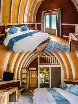 ᴼ Triangular starry sky loft spoon wooden house suite: Divided into two floors, with a large space. The panoramic floor-to-ceiling window offers a view of the distant mountains and forests. The interior decoration style incorporates natural elements, providing a comfortable stay.