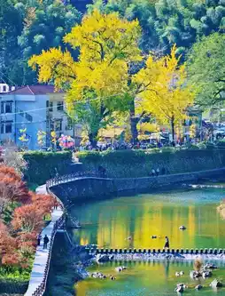 ✅Beixi Village. The stunning fall foliage in Beixi is due to the mountains covered in red maples and three ancient ginkgo trees. Under the ginkgo trees, the ground is covered with fallen leaves, a sea of gold. When sunlight shines on the ancient trees, the leaves glow, creating a healing and comfortable atmosphere. The beauty of Beixi Village is not only in the fall foliage but also in the streams, weirs, ancient bridges, and the Wenchang Pavilion on the small hill in the village. You can reach Wenchang Pavilion by turning right along the Danfeng Ancient Path, and after passing through Wenchang Pavilion, descend from Moon Bay.