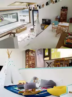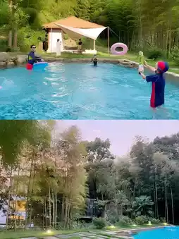 💦Little stream water, small outdoor swimming pool🏊♂️, surrounded by green mountains⛰️, starry sky at night🌌~ Open the window and there is a large green area, children's play area, bookstore, teahouse...it's too relaxing~