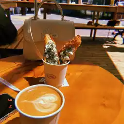 Highlights - The glass cafe front gives a great feeling of summer. Drinks are unique and some interesting cake choices. Prices are good.