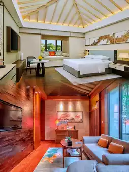 218 guest rooms, each offering breathtaking scenery, blend modern sophistication with pavilions and lakeside charm. From standard rooms, deluxe rooms, lake-view rooms, garden-view rooms to suites, every room caters to guests who adore mountains or water. Spacious 45-square-meter rooms ensure a comfortable stay, complete with bathtubs for ultimate relaxation.