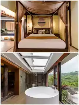 The rooms blend warmth and sophistication. Four-poster carved beds paired with soft, skin-friendly bedding create a cozy and restful sleep space. Antique desks and display shelves adorned with delicate tea sets and small ornaments allow guests to immerse themselves in Chinese elegance during their stay. Some rooms feature large floor-to-ceiling windows or skylights, offering breathtaking views of the mountains and forests, and the chance to sleep under a starry sky, embracing the beauty of nature.