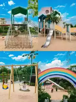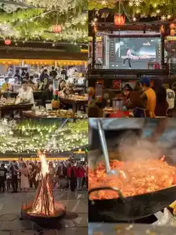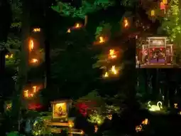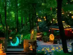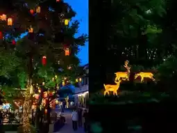 Colorful lanterns hang among the treetops, bringing a festive atmosphere.