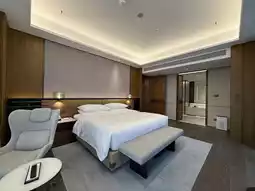 Guest room: The room area is 94 square meters, and the room type is an executive lake view suite. Room 01 is facing Tianming Lake, the layout is quite regular, and the moving line layout is quite reasonable. From the three dimensions of guest room space, soft decoration layout, and detail placement, it is very good. The room is wrapped in light wood tones and wood, showing a home atmosphere in simplicity. The surprise is that the corner suite has three balconies, directly 270 degrees panoramic view of Tianming Lake. It has been nearly two years since its opening.