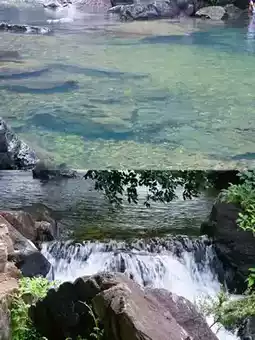 Walking along the creek, the sound of water gradually becomes clear in your ears. The creek after the rain is especially lively, with abundant water that seems to be joyfully running and jumping, weaving through rocks and splashing countless droplets, naturally forming a series of small waterfalls and crystal-clear pools. The shallows are full of playful figures; children step barefoot into the water, their crisp laughter mingling with the babbling stream, creating the most beautiful summer symphony. I deliberately slowed my pace, letting the coolness of the creek seep through my shoes and wash away the heat—this comfort is especially precious in the height of summer. A roadside sign quietly "spoils the plot": this is a filming location for "Sword Snow Stride," no wonder the scene before me looks so familiar—lush green mountains embrace the area, the creek rushes endlessly, and mist swirls around, as if the ethereal scenes from the show have come to life.