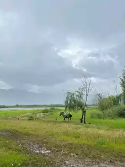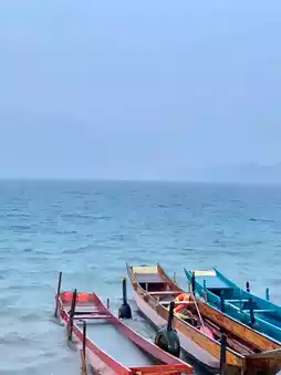 Its calm, clear waters shimmer in shades of turquoise and sapphire, depending on the light. The lake stretches over 50 square kilometers, and several small islands rise from its surface, adding to its magical atmosphere.