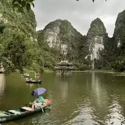 A place where you can see caves and floating temples from a boat rowed by a boatman, famous for the filming location of Kong Skull Island