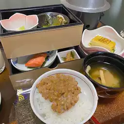 Breakfast consists of fresher menus compared to dinner. There was also natto, so I ate it with rice as a healthy meal.