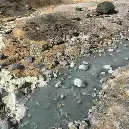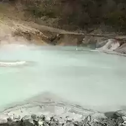 The remains of an explosion crater where an active volcano erupted, with boiling water making a gurgling sound🌋