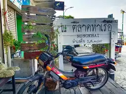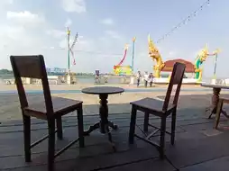 β Today we will take you to visit Nong Khai Province. We will walk along the Mekong River and go shopping at Tha Sadet Market. We found a cafe with a cool breeze on the road along the Mekong River. The shop is called Na Talat Tha Ruea. π Na Talat Tha Ruea Cafe is a wooden shop decorated in an 80-90s style. The chairs and tables are all made of wood. Most importantly, the atmosphere is very good because it is located next to the Mekong River. You can sit and relax, enjoy the cool breeze, watch people walking by, and take pictures of the 2 Nagas along the Mekong River. π Note: This shop does not have air conditioning because the wind from the river is already cool.