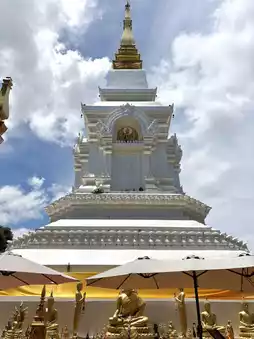 There are also Buddha images at various points within the temple. Visitors can come to pay their respects, make merit, bathe the Phra That, and donate sand to the temple. Parking is convenient and adequate, with plenty of shade and trees. The temple is located on a 4-lane road, making it easy to access. It is approximately 20 kilometers from Nong Khai city.