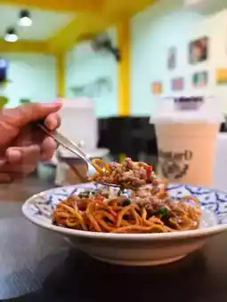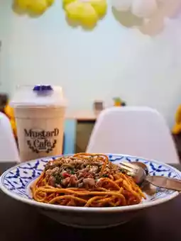 💞 Mustard Cafe Nong Khai is a hidden cafe hidden in an alley, but it has convenient parking. The atmosphere of the shop is warm and friendly, decorated in bright yellow tones. There are both indoor and outdoor seating areas on the 2nd floor. The staff are friendly and helpful. The food and beverage menus are diverse and inexpensive. The taste is delicious and satisfying, especially the coconut blossom coffee with its unique aroma and the soft cake that is not too sweet. In addition, the shop also provides free cold water, refillable, creating a good impression when using the service.