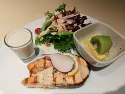 ➡️ Salmon Steak with Lemon Sauce - It's also served with a vegetable salad. The fish pieces are large and thick, cooked just right. The overall taste is milder than the first two dishes, but it's still good.