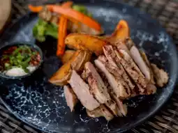 The restaurant is surrounded by rice fields, with both air-conditioned and outdoor areas. There are ducks strolling around, a pond for feeding fish, and a charming natural setting. Immerse yourself in nature without having to travel far to the provinces. It's right here in Rama 5, Nonthaburi.