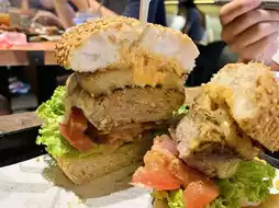 The hamburger meat is very thick and juicy. It is hard to bite it in one bite and needs to be cut into pieces before eating.
