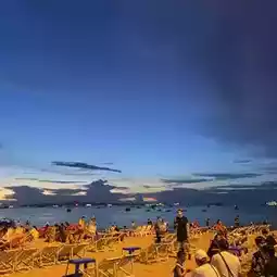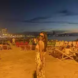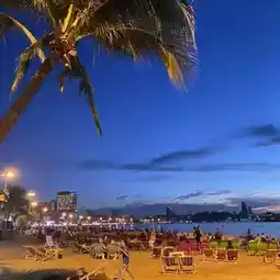 This is the Pattaya beach road. There are many hotels, restaurants, and cafes. When we go to Pattaya, we like to go here a lot. There are many places to stay and restaurants. Plus, there is a sandy beach here. It's very beautiful to sit and relax and watch the stars at night.