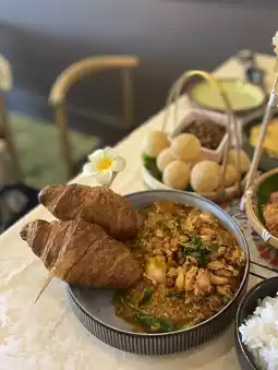 Wok & Whisk in Penang is a cozy café that delights diners with its creative take on Thai-inspired cuisine. One of its standout dishes is the Thai curry crab served with a buttery croissant—a unique pairing that perfectly blends bold flavors with comfort. The rich, aromatic curry is infused with spices and herbs, coating the tender crab meat in a creamy, savory sauce. Paired with the flaky, golden croissant, it creates an indulgent and memorable dining experience that’s both hearty and satisfying. With its relaxed ambiance and inventive menu, Wok & Whisk offers a fresh twist on familiar Thai favorites.