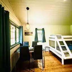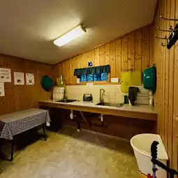 There are two sets of bunk beds in the wooden house. There is a mini kitchen without a sink, so you have to bring a bucket to the common area to get water. But being able to cook, eat, sleep and stay warm in a heated wooden house is already super happy. !