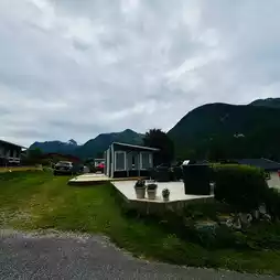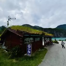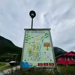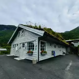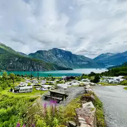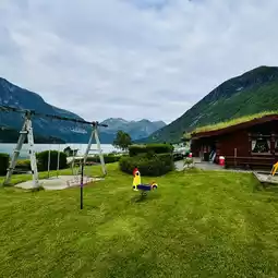 This campground is truly enormous, boasting 35 cabins, two summerhouses, a mountain cabin, and five apartments. Twelve of the cabins are basic, while the others and apartments are of a higher standard, equipped with showers, toilets, and dishwashers. All cabins and apartments feature outdoor areas with garden furniture and offer views of Lake Strynsvatn and the surrounding mountains. We opted for the most basic camping cottage. The owner quoted us NOK 1,300 and NOK 1,800 respectively, differing in size and amenities. Showers offered unlimited time, no coins required, and plenty of hot water. Each cabin also had a kitchenette with all utensils and utensils, and most importantly, a sink. However, there was no toilet or bathroom. The shared bathroom was spacious and clean, with separate wet and dry areas. The women's bathroom has a hairdryer (the men's doesn't). There's also a children's play area outdoors, complete with swings, a large trampoline, beach volleyball, and a mini-climbing area. There was also a cherry tree laden with fruit outside our cabin. My sister picked some before leaving and said they were sour and sweet. This large, complex campground is nestled along the hillside, offering accommodations for tents, campervans, and long-term rentals of campervans and cabins. It caters to all needs. Before leaving, we drove to the highest point for a panoramic view of the campground, Lake Strynsvatn, and the surrounding mountains.