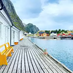 Walking across the bridge, you get incredible panoramic views of the village and the dramatic peaks beyond. The atmosphere is calm and peaceful, making it a perfect spot to slow down, take photos, or simply enjoy the scenery. Whether you are passing through on a Lofoten road trip or staying in one of the cozy cabins, Hamnøy is the kind of place that makes you fall in love with Norway’s raw beauty.