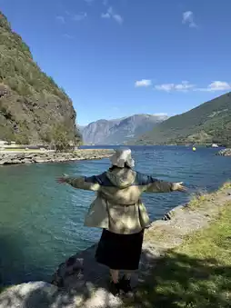 The highlight was definitely the Flam Railway 🚂, one of the steepest train journeys in the world! It winds through tunnels and alongside roaring waterfalls 🌊. A special stop at Kjosfossen waterfall treated us to a magical sight: a red-dressed “dancing lady” 💃✨, a mythical Huldra from Norwegian folklore, appearing in the mist.