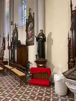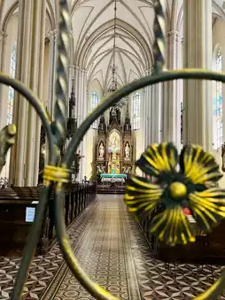 Located in the city center, its pointed Gothic-style tower is striking. The exterior, with its combination of gold and beige, looks like something out of a storybook. Upon entering, the soft light streaming through the stained glass fills the quiet space, making you instinctively take a deep breath.