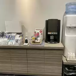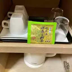 There was green tea and a kettle under the desk, and free water drinks in the refrigerator.