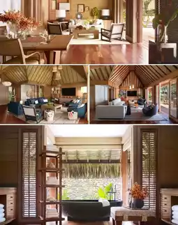 Each overwater villa comes with its own "private ocean" – just step down the ladder into the clear waters whenever the mood strikes 🌊 Warm, sophisticated wood interiors and floor-to-ceiling windows frame the sea like living art. Watch sunsets from bed while listening to the waves for ultimate island relaxation!