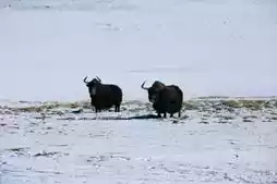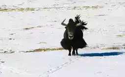 Wild yaks, these giant beasts on the plateau, resist the severe cold and wind and frost with their heavy bodies and long hair. The hard horns show the tenacity and toughness of life.