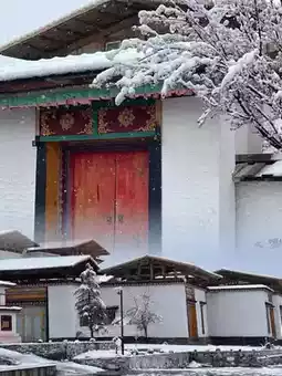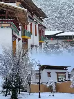 The town of Rulong is an international tourist destination. It's a small place, but it's very clean and tidy everywhere. The architectural style of the houses is lazy in Tibetan, but the interior decoration is still very traditional Han. The original traditional Tibetan houses have been improved a lot, but you can still see the characteristics of Tibetans. Although the peach blossom festival in Nyingchi has passed, there are still many peach blossoms blooming, but these two days have been covered by heavy snow on the branches, the heavy snow swaying on the flowers, the top is white snow, the bottom is pink flowers, you can imagine a bunch of beautiful scenery. The sound of snow shoes stepping on the snow, it's been a long time since I played like this. I still miss the taste of butter tea, full of sheep milk flavor, thin, floating a layer of butter