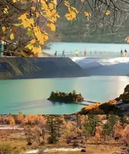 The lake water looks like flowing turquoise, gently embraced by golden trees. Walk along the lakeside boardwalk, with a soft carpet of pine needles underfoot and sunlight filtering through the leaves like scattered gold. Be sure to visit the viewing platform on the island in the middle of the lake! The mirror-like photos you take will flood your social feed with questions📸