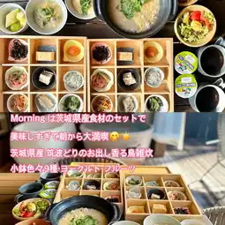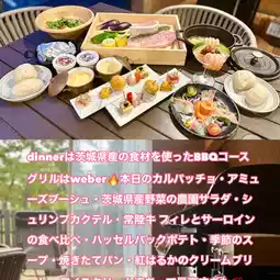 (Enjoy the evening BBQ full course with Ibaraki ingredients on the covered terrace and the morning set in a wooden box. It was voluminous and the Ibaraki ingredients were so delicious that it was entertaining and fun🍮🥩BALMUDA and other appliances are also available, so you can bring your own🉑)